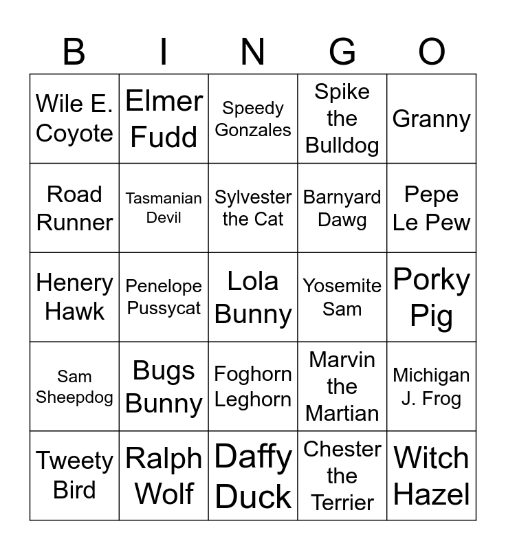This bingo card has 25 words: Bugs Bunny, Daffy Duck, Sylvester the Cat, Tweety Bird, Granny, Wile E. Coyote, Road Runner, Elmer Fudd, Yosemite Sam, Foghorn Leghorn, Barnyard Dawg, Henery Hawk, Marvin the Martian, Michigan J. Frog, Tasmanian Devil, Witch Hazel, Porky Pig, Speedy Gonzales, Pepe Le Pew, Penelope Pussycat, Lola Bunny, Ralph Wolf, Sam Sheepdog, Spike the Bulldog and Chester the Terrier.