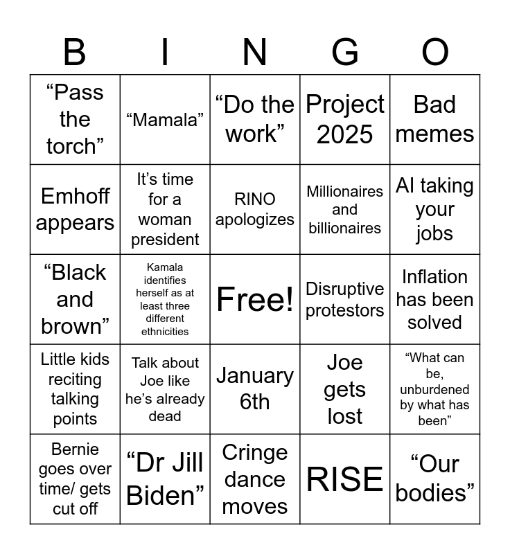 This bingo card has a free space and 24 words: Talk about Joe like he’s already dead, “Dr Jill Biden”, RINO apologizes, Bernie goes over time/ gets cut off, Bad memes, “Pass the torch”, Emhoff appears, “Mamala”, Disruptive protestors, January 6th, Millionaires and billionaires, “Black and brown”, Joe gets lost, “What can be, unburdened by what has been”, It’s time for a woman president, RISE, Inflation has been solved, “Do the work”, AI taking your jobs, Kamala identifies herself as at least three different ethnicities, “Our bodies”, Little kids reciting talking points, Project 2025 and Cringe dance moves.