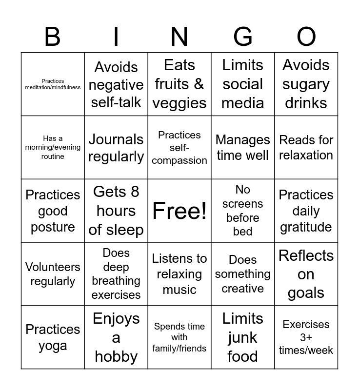 This bingo card has a free space and 29 words: Practices yoga, Drinks 8 glasses of water daily, Gets 8 hours of sleep, Walks in nature regularly, Practices meditation/mindfulness, Eats fruits & veggies, Journals regularly, Does deep breathing exercises, No screens before bed, Enjoys a hobby, Practices daily gratitude, Exercises 3+ times/week, Spends time with family/friends, Limits junk food, Reads for relaxation, Takes study/work breaks, Listens to relaxing music, Volunteers regularly, Avoids sugary drinks, Practices good posture, Does something creative, Spends time outdoors daily, Manages time well, Has a morning/evening routine, Limits social media, Avoids negative self-talk, Reflects on goals, Practices self-compassion and Unplugs from tech weekly.