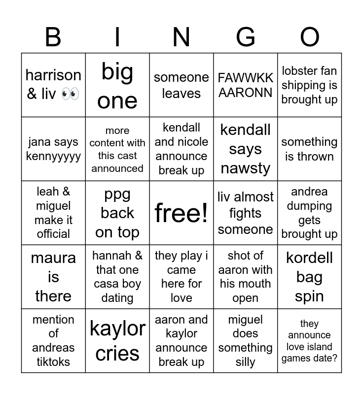 This bingo card has a free space and 24 words: hannah & that one casa boy dating, kaylor cries, kendall and nicole announce break up, mention of andreas tiktoks, lobster fan shipping is brought up, harrison & liv 👀, jana says kennyyyyy, big one, liv almost fights someone, they play i came here for love, kendall says nawsty, leah & miguel make it official, shot of aaron with his mouth open, kordell bag spin, more content with this cast announced, miguel does something silly, andrea dumping gets brought up, someone leaves, something is thrown, ppg back on top, they announce love island games date?, maura is there, FAWWKK AARONN and aaron and kaylor announce break up.