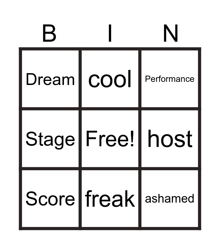 This bingo card has a free space and 17 words: Contest, Singers, Performance, Dream, Rivals, Stage, Melody, Score, freak, host, induñlge, submission, ashamed, cool, elf, respect and disqualified.