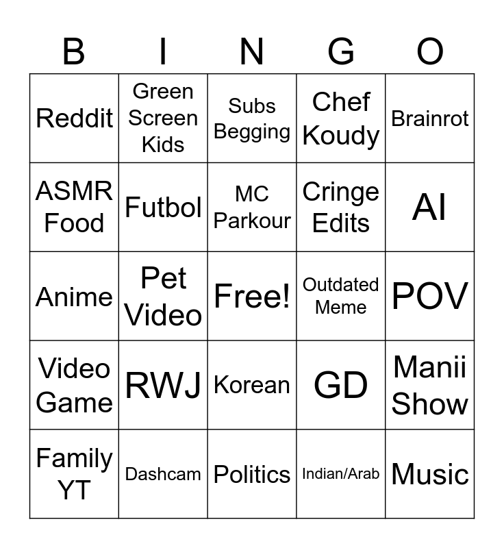 This bingo card has a free space and 24 words: RWJ, Dashcam, MC Parkour, Family YT, Brainrot, Reddit, ASMR Food, Green Screen Kids, Outdated Meme, Korean, Cringe Edits, Anime, GD, Manii Show, Futbol, Indian/Arab, POV, Subs Begging, AI, Pet Video, Music, Video Game, Chef Koudy and Politics.