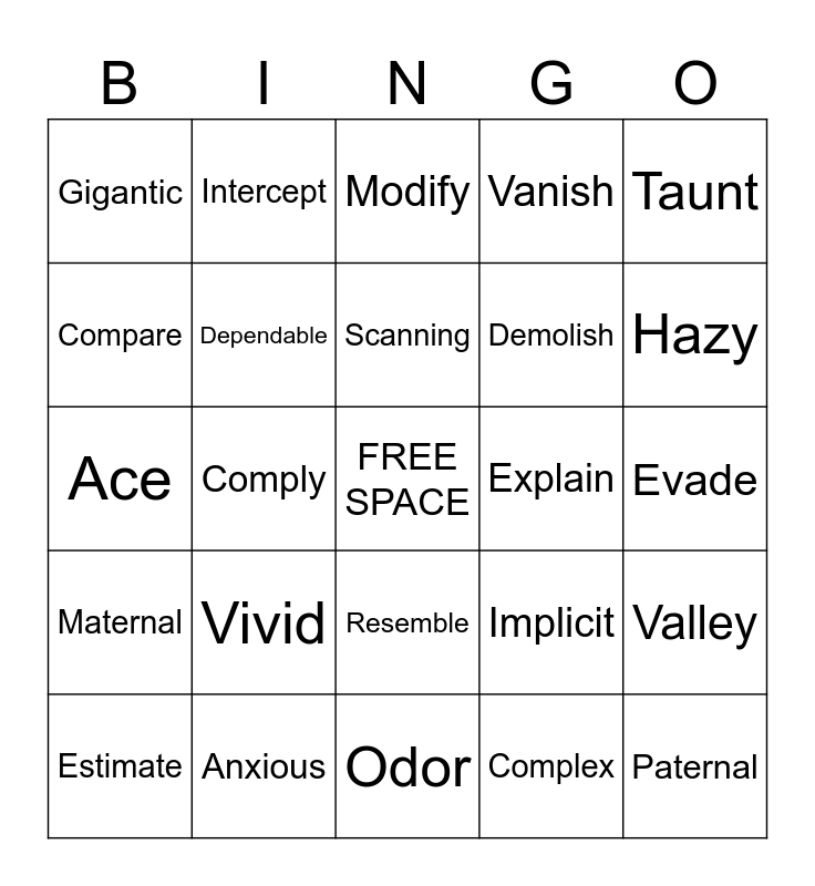 This bingo card has a free space and 24 words: Vivid, Anxious, Scanning, Estimate, Taunt, Gigantic, Compare, Intercept, Explain, Resemble, Demolish, Ace, Implicit, Valley, Dependable, Complex, Evade, Modify, Hazy, Comply, Paternal, Maternal, Vanish and Odor.