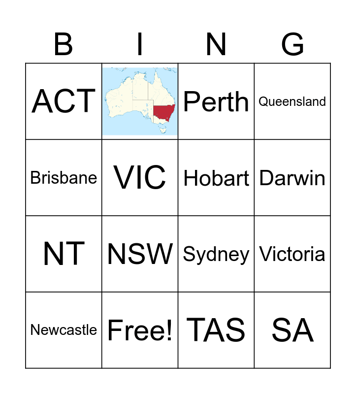 This bingo card has 4 images and 23 words: Melbourne, NT, VIC, Perth, SA, Free!, Australian Capital Territory, Sydney, Queensland, Adelaide, NSW, Tasmania, Hobart, Darwin, Canberra, ACT, TAS, South Australia, Victoria, Newcastle, Dubbo, Brisbane and Alice Springs.