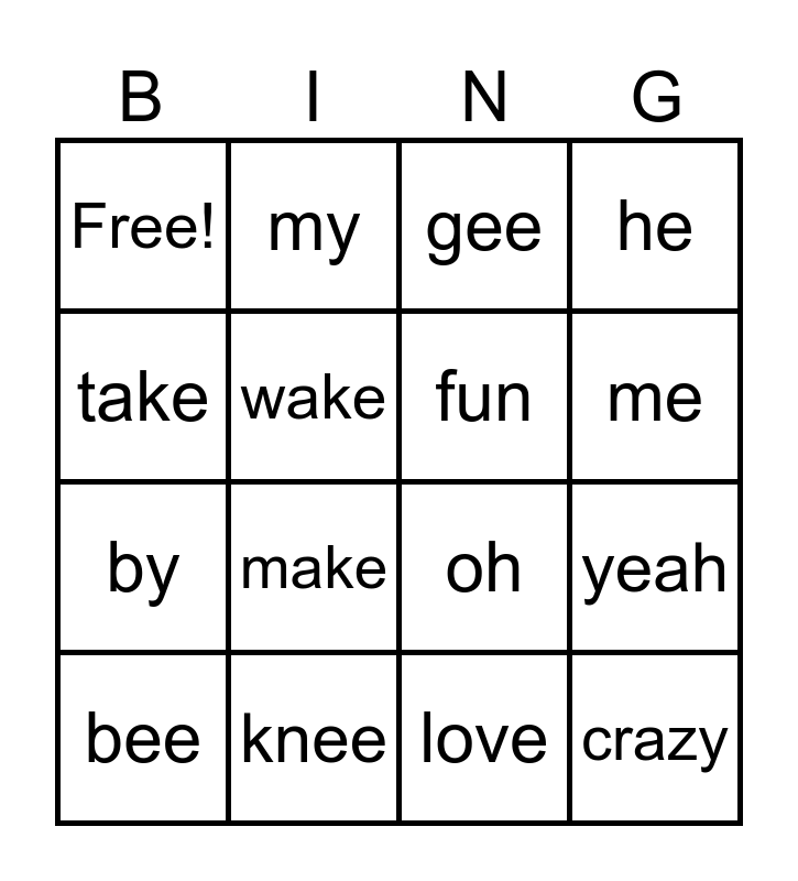 This bingo card has 16 words: bee, knee, gee, he, take, my, oh, yeah, Free!, wake, love, me, by, make, fun and crazy.