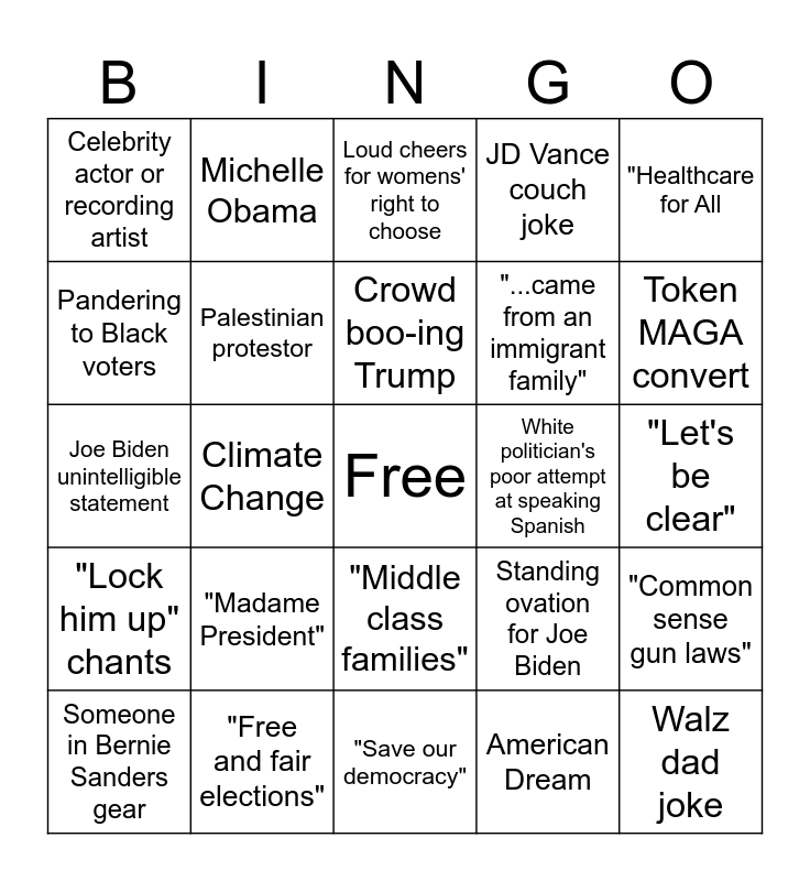 This bingo card has a free space and 28 words: "Common sense gun laws", Hillary pants suit, "...came from an immigrant family", American Dream, Pandering to Black voters, Loud cheers for womens' right to choose, Michelle Obama, "Lock him up" chants, White politician's poor attempt at speaking Spanish, Someone in Bernie Sanders gear, Joe Biden unintelligible statement, JD Vance couch joke, "Free and fair elections", "Save our democracy", Token MAGA convert, "January 6th", "Madame President", Palestinian protestor, Crowd boo-ing Trump, "Middle class families", Celebrity actor or recording artist, Donation ticker at bottom of screen, Walz dad joke, Climate Change, "Let's be clear", Standing ovation for Joe Biden, "Healthcare for All and "Middle class families".