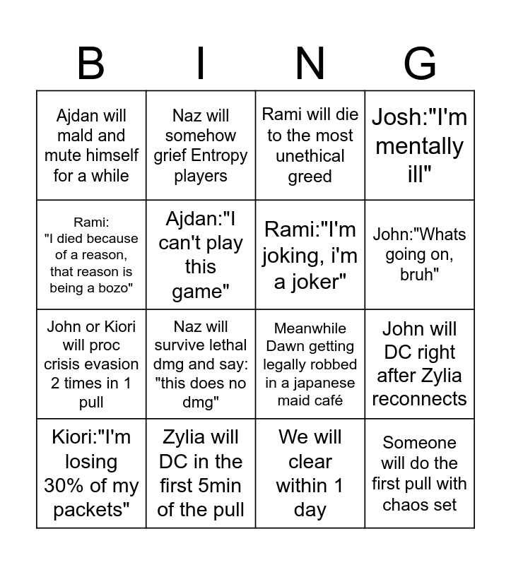 This bingo card has 16 words: Zylia will DC in the first 5min of the pull, John will DC right after Zylia reconnects, Rami will die to the most unethical greed, Ajdan will mald and mute himself for a while, John or Kiori will proc crisis evasion 2 times in 1 pull, Naz will somehow grief Entropy players, Meanwhile Dawn getting legally robbed in a japanese maid café, We will clear within 1 day, Rami: "I died because of a reason, that reason is being a bozo", Ajdan:"I can't play this game", Kiori:"I'm losing 30% of my packets", Josh:"I'm mentally ill", Naz will survive lethal dmg and say: "this does no dmg", John:"Whats going on, bruh", Rami:"I'm joking, i'm a joker" and Someone will do the first pull with chaos set.
