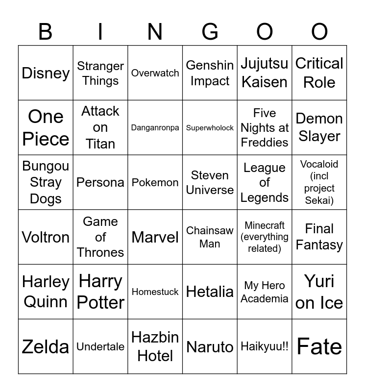 This bingo card has 36 words: Hetalia, Homestuck, Naruto, One Piece, Voltron, Steven Universe, Attack on Titan, Hazbin Hotel, Jujutsu Kaisen, My Hero Academia, Demon Slayer, Genshin Impact, Yuri on Ice, Persona, Superwholock, Disney, Harley Quinn, League of Legends, Bungou Stray Dogs, Overwatch, Pokemon, Game of Thrones, Chainsaw Man, Marvel, Minecraft (everything related), Stranger Things, Five Nights at Freddies, Undertale, Danganronpa, Critical Role, Fate, Zelda, Final Fantasy, Vocaloid (incl project Sekai), Harry Potter and Haikyuu!!.