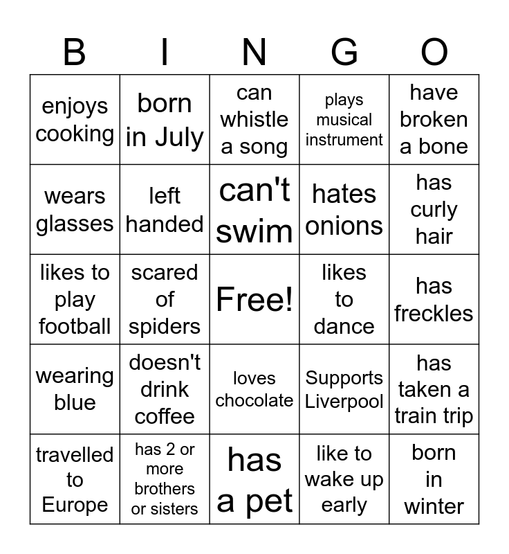 This bingo card has a free space and 24 words: doesn't drink coffee, has 2 or more brothers or sisters, can't swim, travelled to Europe, have broken a bone, enjoys cooking, wears glasses, born in July, likes to dance, loves chocolate, hates onions, likes to play football, Supports Liverpool, has taken a train trip, left handed, like to wake up early, has freckles, can whistle a song, has curly hair, scared of spiders, born in winter, wearing blue, plays musical instrument and has a pet.