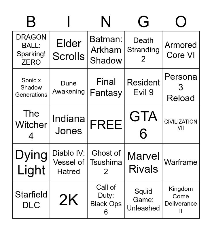 This bingo card has a free space and 31 words: Call of Duty: Black Ops 6, Monster Hunter Wilds, Indiana Jones, Little Nightmares III, DRAGON BALL: Sparking! ZERO, Batman: Arkham Shadow, Dune Awakening, Marvel Rivals, GTA 6, Squid Game: Unleashed, CIVILIZATION VII, Kingdom Come Deliverance II, Lost Records: Bloom & Rage, Mecha Break, Persona 3 Reload, Delta Force, Warframe, Diablo IV: Vessel of Hatred, Dying Light, Ghost of Tsushima 2, Armored Core VI, Splinter Cell, Starfield DLC, Elder Scrolls, Resident Evil 9, Sonic x Shadow Generations, Death Stranding 2, The Witcher 4, 2K, Final Fantasy and Dragon Age.