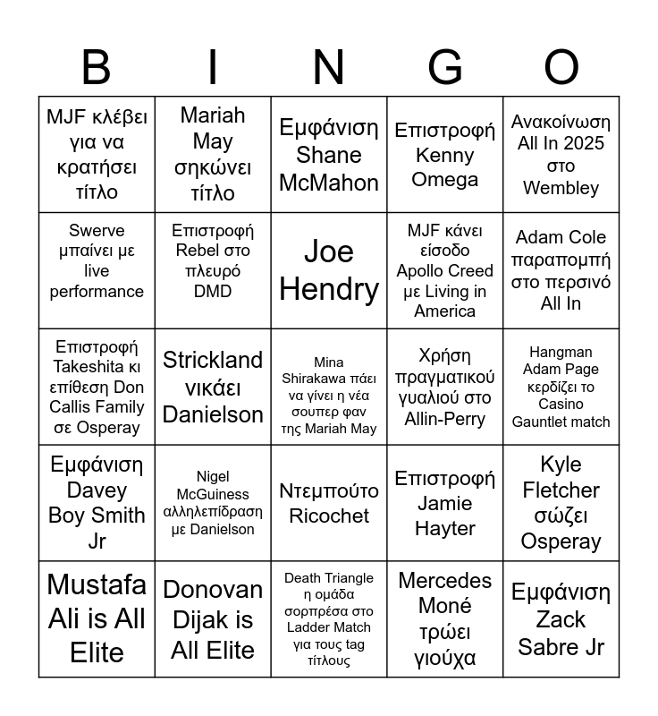 This bingo card has 25 words: Nigel McGuiness αλληλεπίδραση με Danielson, Death Triangle η ομάδα σορπρέσα στο Ladder Match για τους tag τίτλους, Joe Hendry, Mustafa Ali is All Elite, Ανακοίνωση All In 2025 στο Wembley, MJF κλέβει για να κρατήσει τίτλο, Swerve μπαίνει με live performance, Mariah May σηκώνει τίτλο, Χρήση πραγματικού γυαλιού στο Allin-Perry, Ντεμπούτο Ricochet, MJF κάνει είσοδο Apollo Creed με Living in America, Επιστροφή Takeshita κι επίθεση Don Callis Family σε Osperay, Επιστροφή Jamie Hayter, Kyle Fletcher σώζει Osperay, Επιστροφή Rebel στο πλευρό DMD, Εμφάνιση Zack Sabre Jr, Hangman Adam Page κερδίζει το Casino Gauntlet match, Εμφάνιση Shane McMahon, Adam Cole παραπομπή στο περσινό All In, Strickland νικάει Danielson, Mina Shirakawa πάει να γίνει η νέα σουπερ φαν της Mariah May, Donovan Dijak is All Elite, Εμφάνιση Davey Boy Smith Jr, Επιστροφή Kenny Omega and Mercedes Moné τρώει γιούχα.