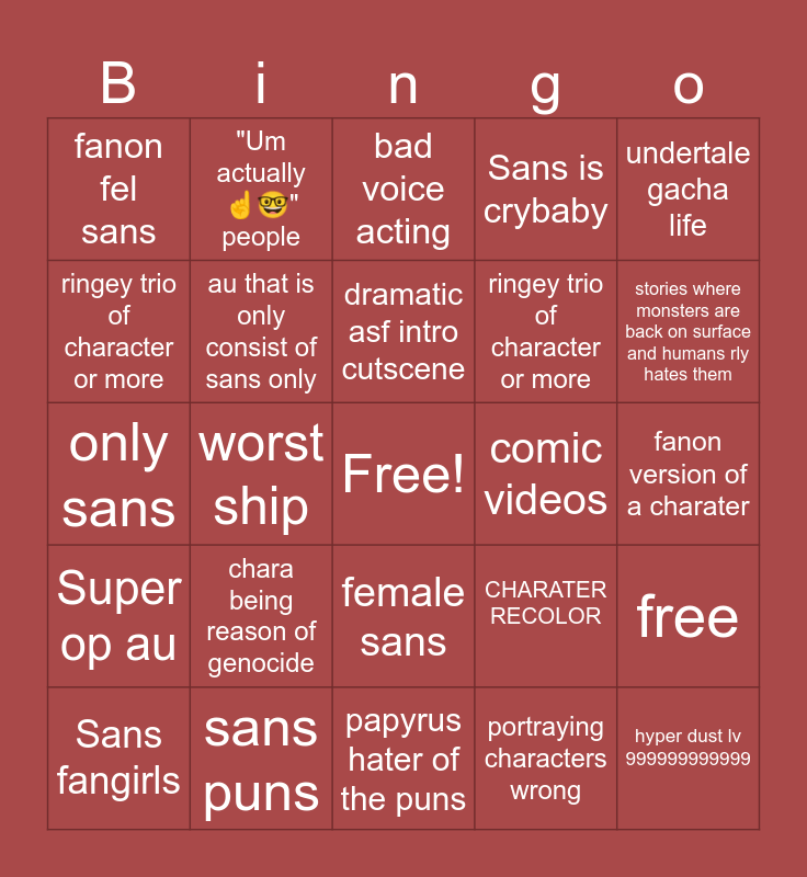 This bingo card has a free space and 29 words: Sans fangirls, frans, worst ship, sussy, fanon fel sans, bad voice acting, au that is only consist of sans only, chara being reason of genocide, comic videos, sans puns, fanon version of a charater, hyper dust lv 999999999999, papyrus hater of the puns, portraying characters wrong, stories where monsters are back on surface and humans rly hates them, not frisk space (main character isn't frisk), female sans, Super op au, undertale gacha life, only sans, CHARATER RECOLOR, megalovania motif, ringey trio of character or more, ringey trio of character or more, Sans is crybaby, "Um actually ☝️🤓" people, free, dramatic asf intro cutscene and Members of ut communities being exposed as child likers.