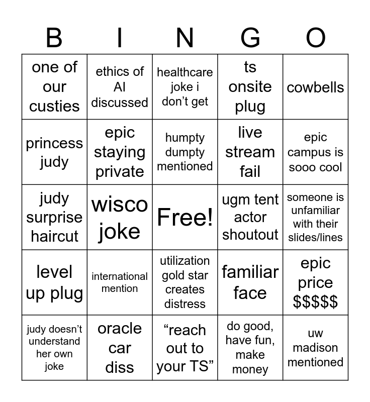 This bingo card has a free space and 24 words: international mention, oracle car diss, humpty dumpty mentioned, judy doesn’t understand her own joke, cowbells, one of our custies, princess judy, ethics of AI discussed, ugm tent actor shoutout, utilization gold star creates distress, live stream fail, judy surprise haircut, familiar face, epic price $$$$$, epic staying private, do good, have fun, make money, someone is unfamiliar with their slides/lines, healthcare joke i don’t get, epic campus is sooo cool, wisco joke, uw madison mentioned, level up plug, ts onsite plug and “reach out to your TS”.
