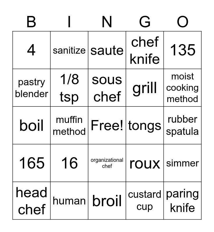 This bingo card has a free space and 39 words: 1/4 c., 3, 2, 1/8 tsp, head chef, organizational chef, sous chef, 41, 135, 165, muffin method, chef knife, paring knife, rubber spatula, tongs, 16, 1, 4, 8, roux, pastry blender, broil, grill, moist cooking method, dough hook, flat paddle, dutch oven, chefs pan, paper towel, sanitize, cutting board, pastry brush, saute, human, custard cup, 20, simmer, boil and rags.