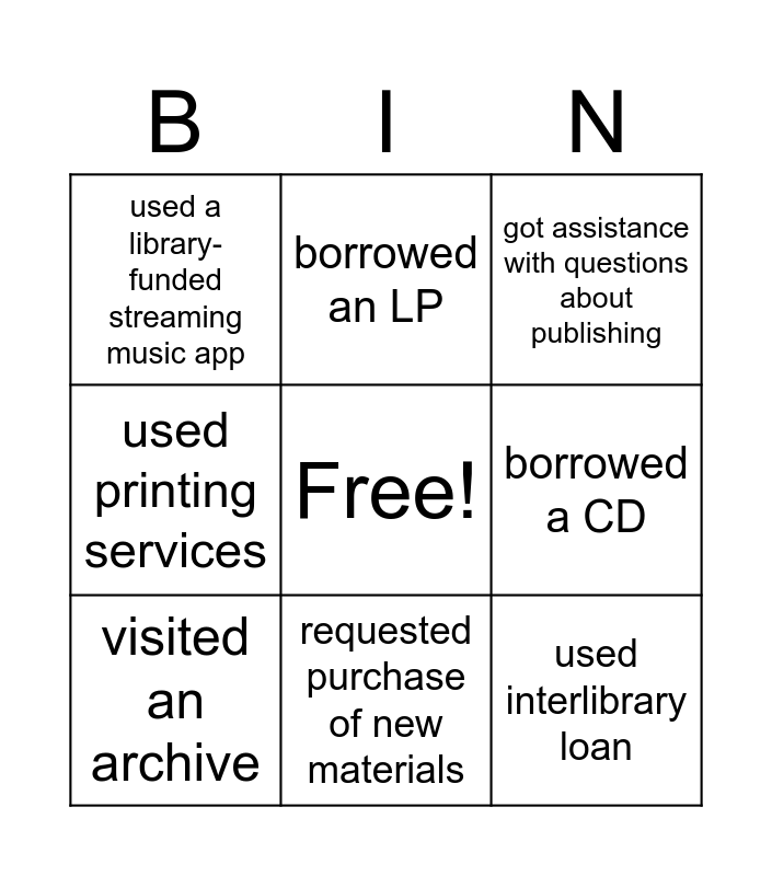 This bingo card has a free space and 25 words: borrowed A/V equipment, checked out an ebook, requested purchase of new materials, had a consultation with a librarian, used interlibrary loan, used a library-funded streaming music app, borrowed a CD, borrowed an LP, got help producing an audition tape, edited a video or audio project, reserved a meeting space, used gaming equipment, experimented with electronic instruments, did archival research, visited an archive, had their performance added to an archive, got help with copyright, got assistance with questions about publishing, scanned a score, checked out a record player, accessed scholarly articles, used microfilm, read a professional magazine, used printing services and checkout a rare musical score.