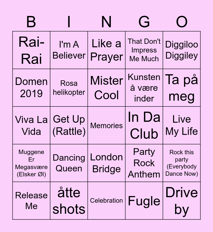 This bingo card has 25 words: Dancing Queen, Celebration, Mister Cool, Release Me, Diggiloo Diggiley, Rai-Rai, Domen 2019, I'm A Believer, In Da Club, London Bridge, Kunsten å være inder, Viva La Vida, Party Rock Anthem, Rock this party (Everybody Dance Now), Rosa helikopter, Drive by, Live My Life, Like a Prayer, Ta på meg, Get Up (Rattle), Memories, åtte shots, Muggene Er Megasvære (Elsker Øl), That Don't Impress Me Much and Fugle.