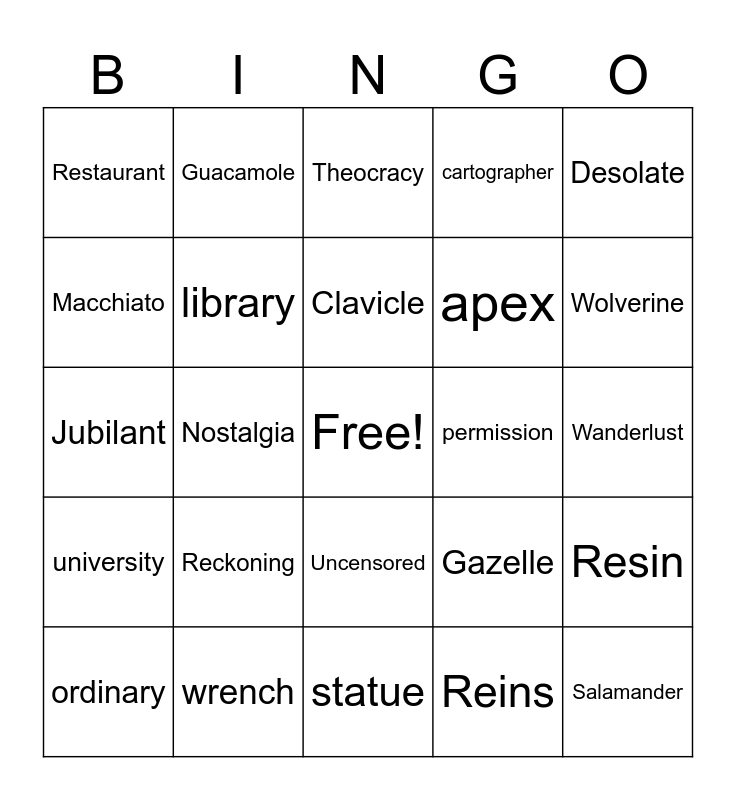 This bingo card has a free space and 42 words: Pergola, Clavicle, Ravine, Reckoning, Reins, Resin, Salamander, Tambourine, Theocracy, Uncensored, Wanderlust, Wolverine, Nostalgia, Desolate, Etiquette, Gazelle, Jacuzzi, Jubilant, Benevolent, Guacamole, Macchiato, Mosaic, Thermodynamics, Restaurant, absurdity, champagne, apex, roster, hiatus, renovate, painting, university, library, statue, ceiling, ordinary, wrench, permission, debauchery, fiduciary, cartographer and anniversary.