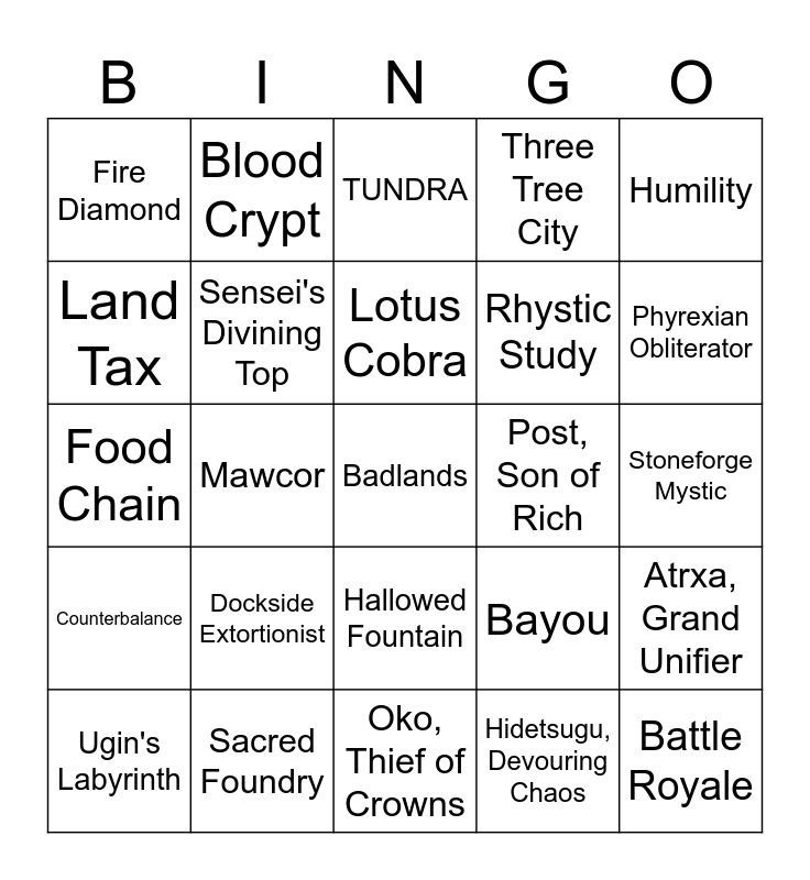 This bingo card has a free space and 24 words: Dockside Extortionist, Sacred Foundry, Lotus Cobra, Ugin's Labyrinth, Humility, Fire Diamond, Land Tax, Blood Crypt, Post, Son of Rich, Hallowed Fountain, Rhystic Study, Food Chain, Bayou, Atrxa, Grand Unifier, Sensei's Divining Top, Hidetsugu, Devouring Chaos, Stoneforge Mystic, TUNDRA, Phyrexian Obliterator, Mawcor, Battle Royale, Counterbalance, Three Tree City and Oko, Thief of Crowns.