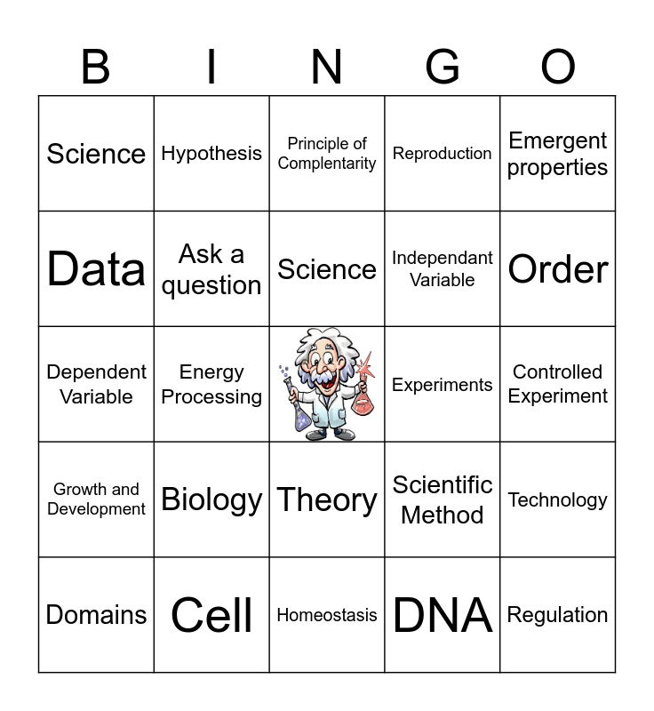 This bingo card has a free space and 24 words: Biology, Cell, Science, Domains, Emergent properties, Science, Data, Hypothesis, Experiments, Theory, Independant Variable, Dependent Variable, Scientific Method, Technology, Ask a question, DNA, Controlled Experiment, Principle of Complentarity, Order, Energy Processing, Regulation, Growth and Development, Reproduction and Homeostasis.