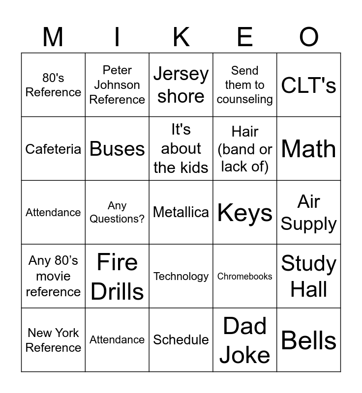 This bingo card has 38 words: John joke, Being old reference, Lunch, Buses, Study Hall, Fire Drills, It's about the kids, Positive Relationships, CLT's, Hair (band or lack of), Any Questions?, Send them to counseling, Metallica, Air Supply, Cafeteria, Any 80’s movie reference, The Situation, Jersey shore, Metal band reference, Keys, 80's Reference, Attendance, Math, New York Reference, Buffalo Bills, Schedule, Bells, Lockers, It’s all about the kids, Parents, Busses, Technology, Dad Joke, Peter Johnson Reference, Freshmen, Chromebooks, Attendance and Van Halen.