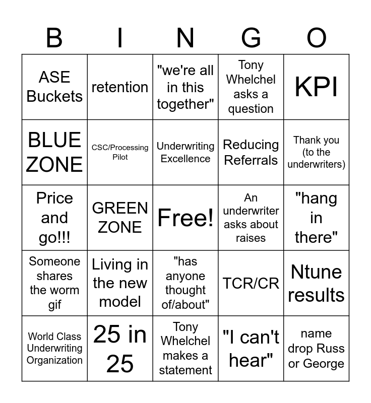 This bingo card has a free space and 24 words: Living in the new model, 25 in 25, Underwriting Excellence, World Class Underwriting Organization, KPI, ASE Buckets, BLUE ZONE, retention, An underwriter asks about raises, "has anyone thought of/about", Reducing Referrals, Price and go!!!, TCR/CR, Ntune results, CSC/Processing Pilot, "I can't hear", "hang in there", "we're all in this together", Thank you (to the underwriters), GREEN ZONE, name drop Russ or George, Someone shares the worm gif, Tony Whelchel asks a question and Tony Whelchel makes a statement.