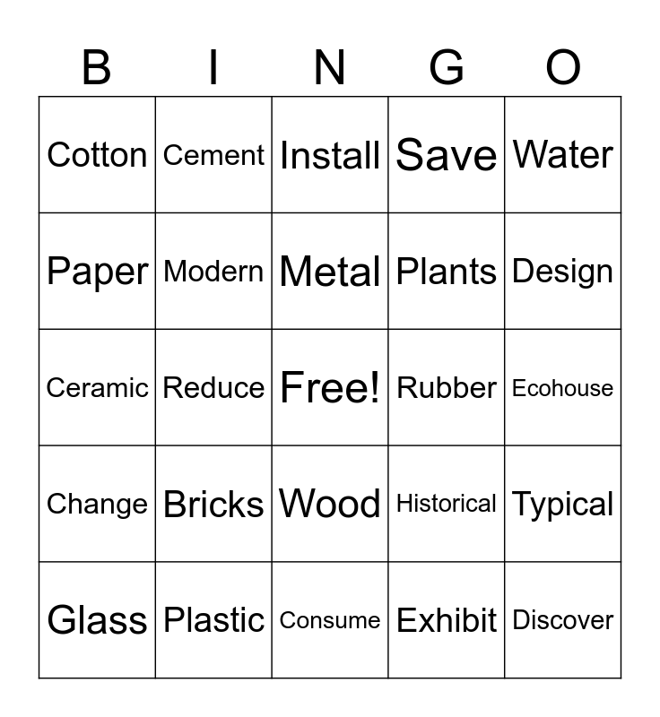 This bingo card has a free space and 24 words: Bricks, Plastic, Metal, Glass, Water, Cotton, Paper, Cement, Rubber, Wood, Plants, Ceramic, Historical, Typical, Modern, Exhibit, Ecohouse, Install, Design, Reduce, Discover, Change, Save and Consume.