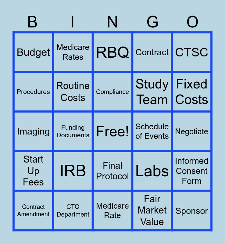 This bingo card has a free space and 24 words: IRB, CTO Department, Compliance, Contract Amendment, CTSC, Budget, Procedures, Medicare Rates, Schedule of Events, Final Protocol, Study Team, Imaging, Labs, Informed Consent Form, Routine Costs, Fair Market Value, Negotiate, RBQ, Fixed Costs, Funding Documents, Sponsor, Start Up Fees, Contract and Medicare Rate.