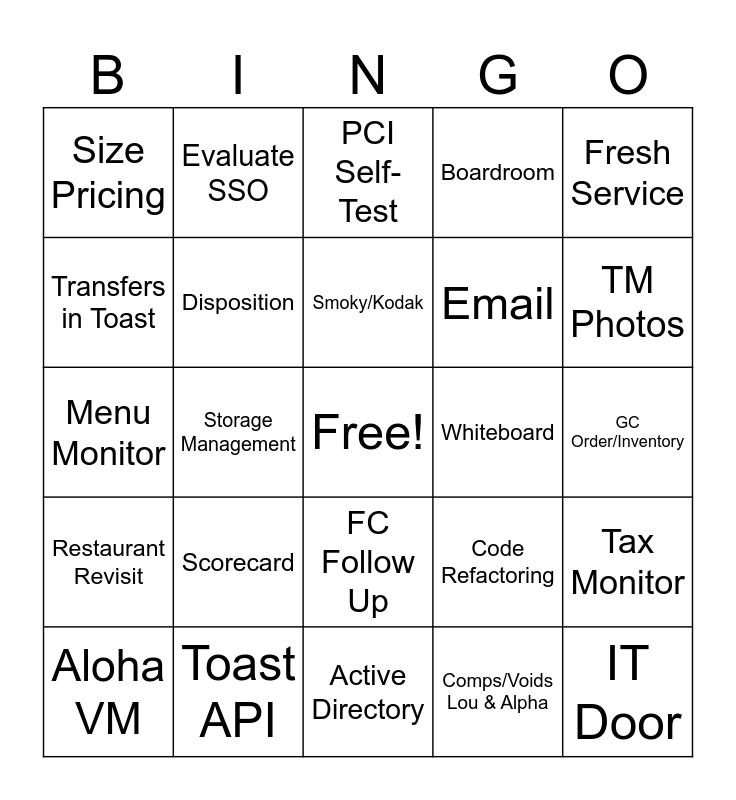 This bingo card has a free space and 39 words: Handhelds, Chabi, Chop House 2.0, Disposition, Aloha VM, FC Follow Up, Smoky/Kodak, Cash Tip Tracker, Fresh Service, Restaurant Revisit, Storage Management, Boardroom, IT Door, GC Order/Inventory, Whiteboard, Scorecard, Doordash, Size Pricing, Menu Clean Up, Code Refactoring, Transfers in Toast, Active Directory, Email, TM Photos, Recipes, InovaAPI, HotSchedules, Portal, Process Review, Evaluate SSO, Firewall, BC/DR, PCI Self-Test, Toast API, Comps/Voids Lou & Alpha, Comps/Voids Review, Tax Monitor, Menu Monitor and Guest Feedback Online.