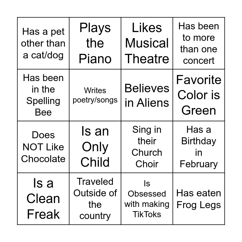 This bingo card has 16 words: Traveled Outside of the country, Has a Birthday in February, Likes Musical Theatre, Has a pet other than a cat/dog, Does NOT Like Chocolate, Plays the Piano, Sing in their Church Choir, Is Obsessed with making TikToks, Has been in the Spelling Bee, Writes poetry/songs, Is a Clean Freak, Has been to more than one concert, Is an Only Child, Favorite Color is Green, Believes in Aliens and Has eaten Frog Legs.
