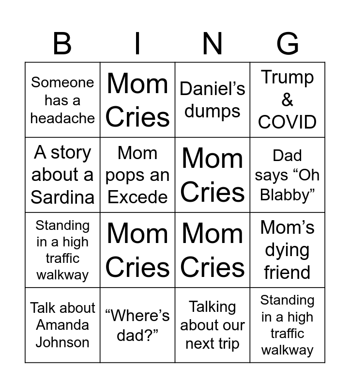 This bingo card has 17 words: Free!, Talk about Amanda Johnson, Mom Cries, Daniel’s dumps, Mom’s dying friend, A story about a Sardina, Mom Cries, Mom Cries, Dad says “Oh Blabby”, Standing in a high traffic walkway, “Where’s dad?”, Mom Cries, Trump & COVID, Someone has a headache, Mom pops an Excede, Talking about our next trip and Standing in a high traffic walkway.