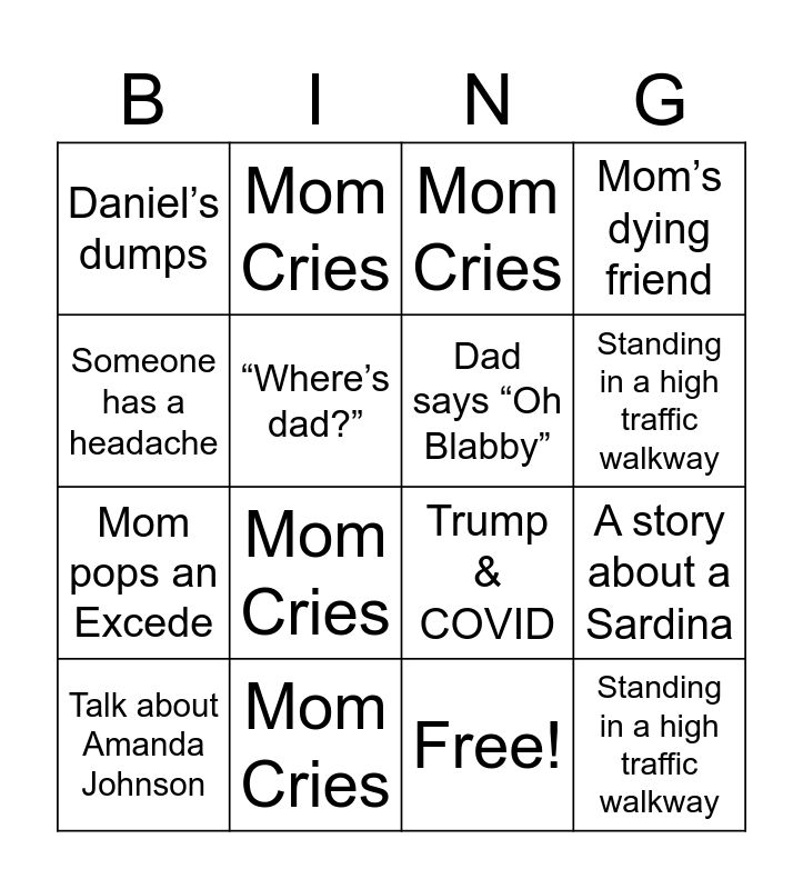 This bingo card has 17 words: Free!, Talk about Amanda Johnson, Mom Cries, Daniel’s dumps, Mom Cries, Mom’s dying friend, A story about a Sardina, Dad says “Oh Blabby”, Standing in a high traffic walkway, “Where’s dad?”, Mom Cries, Trump & COVID, Someone has a headache, Mom Cries, Mom pops an Excede, Talking about our next trip and Standing in a high traffic walkway.