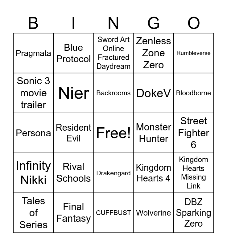 This bingo card has a free space and 24 words: Rival Schools, Final Fantasy, Backrooms, Tales of Series, Rumbleverse, Pragmata, Sonic 3 movie trailer, Blue Protocol, Monster Hunter, Drakengard, DokeV, Persona, Kingdom Hearts 4, Kingdom Hearts Missing Link, Nier, Wolverine, Street Fighter 6, Sword Art Online Fractured Daydream, Bloodborne, Resident Evil, DBZ Sparking Zero, Infinity Nikki, Zenless Zone Zero and CUFFBUST.
