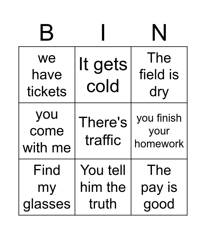 This bingo card has 9 words: Find my glasses, The field is dry, It gets cold, you come with me, we have tickets, you finish your homework, There's traffic, The pay is good and You tell him the truth.