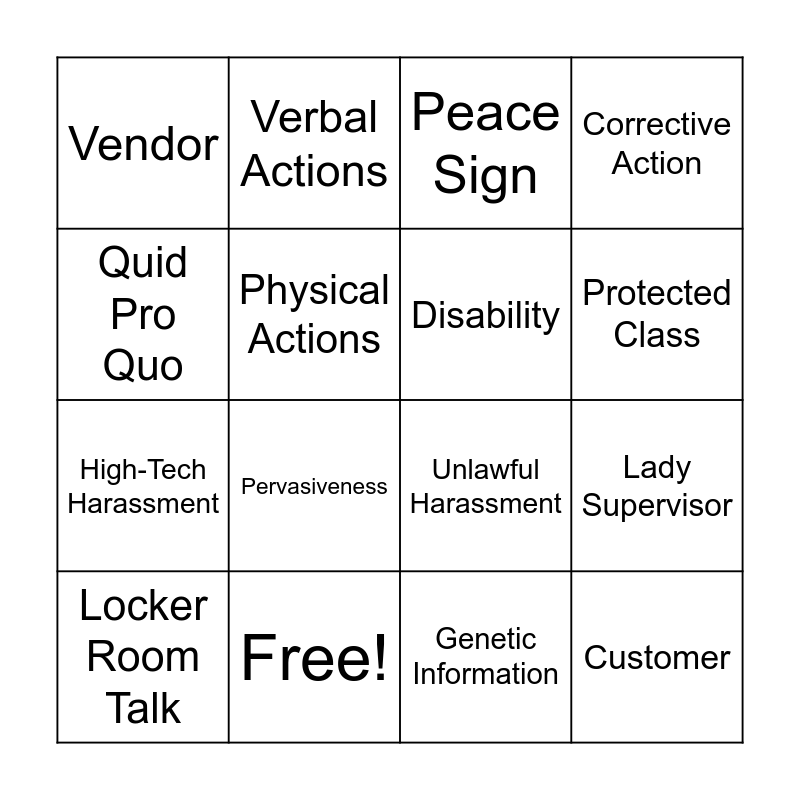 This bingo card has 24 words: Sexual Harassment, Hostile Work Environment, Protected Class, Retaliation, Quid Pro Quo, Vendor, Physical Actions, Verbal Actions, Free!, Intent, High-Tech Harassment, Unlawful Harassment, Discrimination, Platinum Rule, Disability, Veterans Status, Genetic Information, Peace Sign, Pervasiveness, Lady Supervisor, Locker Room Talk, Customer, Corrective Action and Religion.