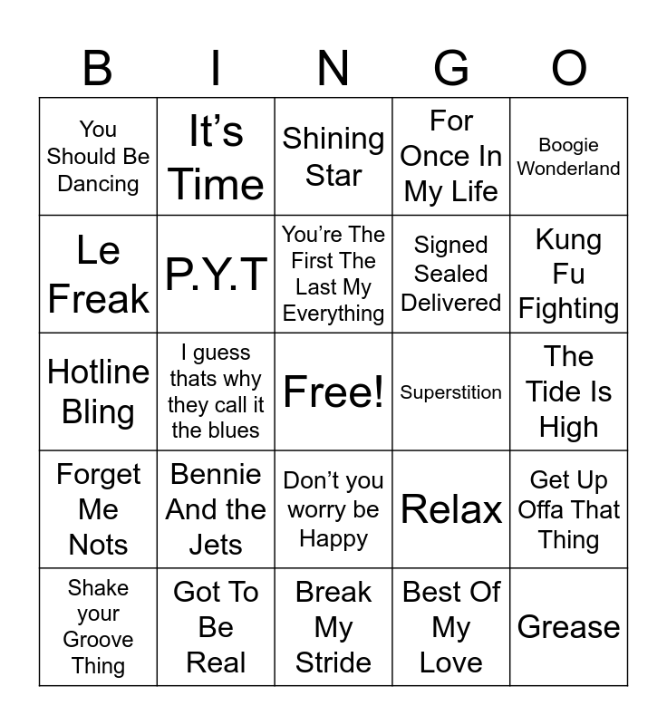 This bingo card has a free space and 59 words: BIRDS OF A FEATHER, Got To Be Real, Made For Me, Forget Me Nots, Best Of My Love, I’m Coming Out, P.Y.T, My Girl, Signed Sealed Delivered, Night Fever, For Once In My Life, Baby Come Back, Le Freak, Rock The Boat, Sir Duke, You Should Be Dancing, Grease, Boogie Wonderland, Don’t You Worry Bout A Thing, You’re The First The Last My Everything, Superstition, Shining Star, Shake your Groove Thing, Get Up Offa That Thing, The Way you Make Me Feel, Lean On Me, Hot Stuff, ABC, Kung Fu Fighting, I Can See Clearly Now, Shes A Bad Mama Jama, Think, Unwritten, Forget You, It’s Time, Do You Remember, You Can Call Me Al, I guess thats why they call it the blues, Waterfalls, Hotline Bling, Hips Dont lie, Bennie And the Jets, The Tide Is High, Circles, Miss Independent, Always Be My Baby, Butter, Calm Down, Don’t you worry be Happy, Break My Stride, Go your Own Way, Summer Nights, Conga, Tainted Love, Here Comes the Sun, Relax, SOS, Soy YO and Say my name.