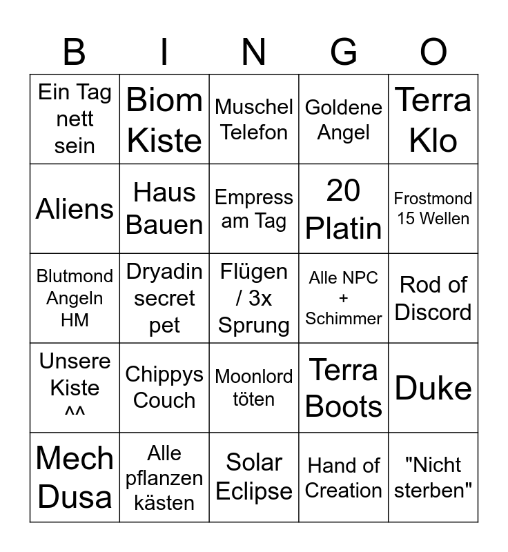 This bingo card has 25 words: Chippys Couch, Solar Eclipse, Empress am Tag, Mech Dusa, Terra Klo, Ein Tag nett sein, Aliens, Biom Kiste, Alle NPC + Schimmer, Moonlord töten, 20 Platin, Blutmond Angeln HM, Terra Boots, Duke, Haus Bauen, "Nicht sterben", Rod of Discord, Muschel Telefon, Frostmond 15 Wellen, Dryadin secret pet, Flügen / 3x Sprung, Alle pflanzen kästen, Unsere Kiste ^^, Goldene Angel and Hand of Creation.
