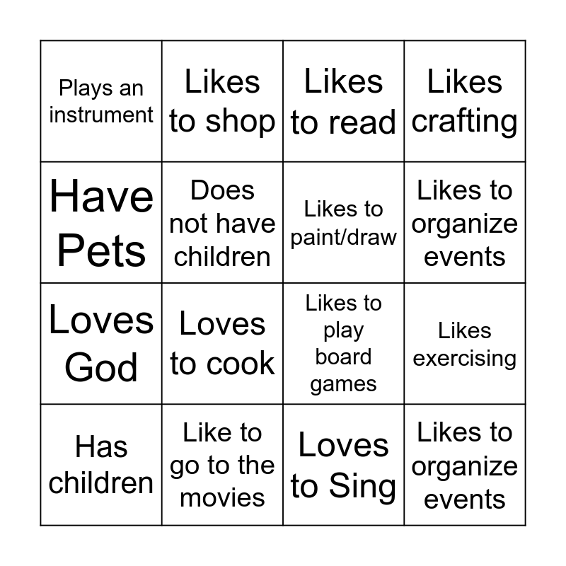 This bingo card has 17 words: Loves to Sing, Has children, Likes to read, Plays an instrument, Loves to cook, Likes crafting, Likes exercising, Likes to paint/draw, Likes to organize events, Does not have children, Like to go to the movies, Likes to play board games, Have Pets, Likes to shop, Loves God, Likes to meet new people and Likes to organize events.
