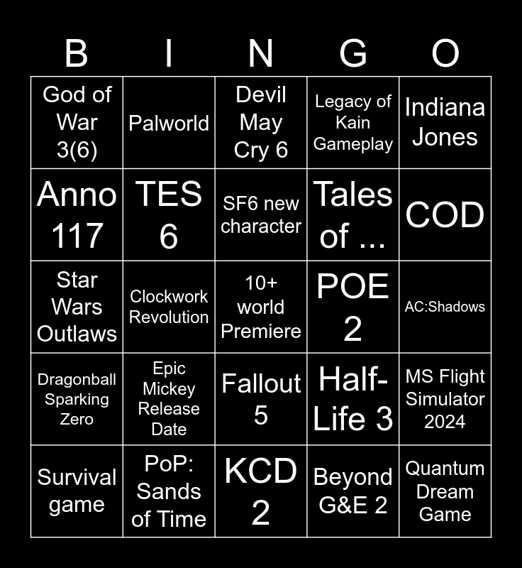 This bingo card has 30 words: PoP: Sands of Time, MH:Wilds Release Date, Clockwork Revolution, Space Marine 2, God of War 3(6), Devil May Cry 6, TES 6, Fallout 5, POE 2, KCD 2, AC:Shadows, 10+ world Premiere, Beyond G&E 2, Quantum Dream Game, COD, WOW:WW, Half-Life 3, Dragonball Sparking Zero, Epic Mickey Release Date, Indiana Jones, Star Wars Outlaws, Doom: Dark Age, Palworld, Tales of ..., Anno 117, Legacy of Kain Gameplay, MS Flight Simulator 2024, Survival game, SF6 new character and Mega Man.