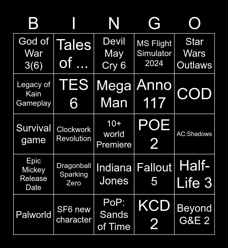 This bingo card has 31 words: PoP: Sands of Time, MH:Wilds Release Date, Clockwork Revolution, Space Marine 2, God of War 3(6), Devil May Cry 6, TES 6, Fallout 5, POE 2, KCD 2, AC:Shadows, 10+ world Premiere, Beyond G&E 2, Quantum Dream Game, COD, WOW:WW, Half-Life 3, Dragonball Sparking Zero, Epic Mickey Release Date, Indiana Jones, Star Wars Outlaws, Doom: Dark Age, Palworld, Tales of ..., Anno 117, Legacy of Kain Gameplay, MS Flight Simulator 2024, Survival game, SF6 new character, Mega Man and Resi 9.