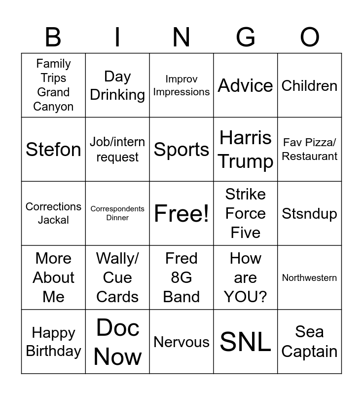 This bingo card has a free space and 24 words: Wally/ Cue Cards, Doc Now, Sports, Happy Birthday, Children, Family Trips Grand Canyon, Stefon, Day Drinking, Strike Force Five, Fred 8G Band, Harris Trump, Corrections Jackal, How are YOU?, Northwestern, Job/intern request, SNL, Stsndup, Improv Impressions, Fav Pizza/ Restaurant, Correspondents Dinner, Sea Captain, More About Me, Advice and Nervous.