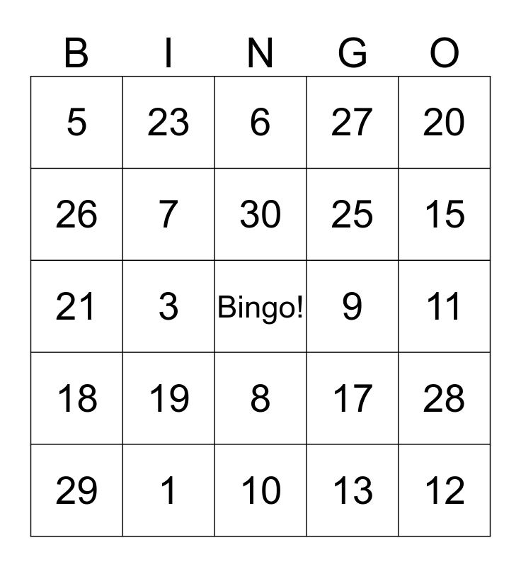 This bingo card has a free space and 30 words: 1, 2, 3, 4, 5, 6, 7, 8, 9, 10, 11, 12, 13, 14, 15, 16, 17, 18, 19, 20, 21, 22, 23, 25, 26, 27, 28, 29, 30 and 31.
