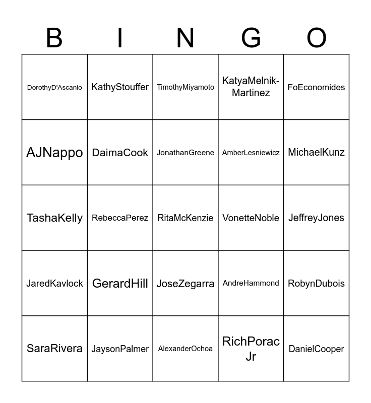 This bingo card has 99 words: JenniferHill, WillieHoward, MichaelLerner, TimothyMiyamoto, VictorPowell, CynthiaReese, Rufina-AureaRoland, KathrynRubeck, OscarSalazar, LoriScherr, HenryStrauch, PeterWalderhaug, YipingWang, JoseZegarra, DiegoLancaster, DorothyD'Ascanio, KathyStouffer, GaryCooley, EricaMurphy, JeanO'Donell, SandroDeLaCruzCarhuapoma, GreciaEucedaSantamaria, YesliNavarreteMedina, OscarBuitrago, BryanBlessing, RobynDubois, JonathanGreene, MeredithLazzaro, TylerLipman, JamesMantzouranis, AlexanderOchoa, RichPorac Jr, CarolineChance, KimberlyBossie, RebeccaPerez, TashaKelly, ChujorChujor, ChelseaFox, TimothyHendricks, GerardHill, HelenaIslam, MichaelKunz, KatyaMelnik-Martinez, JaysonPalmer, PatrickRoberts, EvaMarieSorenson, GrantTipton, AnneMarieWissman, NiambiWills, CherylMalner, WaunitaHoes, RitaMcKenzie, AndreHammond, TanjaHarris, AlexJones, DerekSmith, PatriciaSnowden, IvonneSoto, WestleySye, JamesAndrews, PatrickBelott, FrancesBezila, PaulBolstad, ScottCamillo, AndrewClarke, FoEconomides, KatarinaFarah, AndreasGelner, SammieJoHecox, JaredKavlock, KatelynKlenk, AmberLesniewicz, AJNappo, TracyMartin, MonicaBurruss, SilasCheung, DaimaCook, IeshaDennis, MichelleFord, MoniqueJennings, VonetteNoble, MarcyRalph, ValentineTita, CarrieCarlson, GabrielleCarter, Jeni-LynnDealDeBow, CammieEsch, AlbertoJimenez, JeffreyJones, SaraRivera, JeisonRodriguez, MaribelVerduguez, DanielCooper, KimGagen, AnneMathews, SimonPortnoy, KristySchwatka, AlkaSharma and KimberlyJackson.