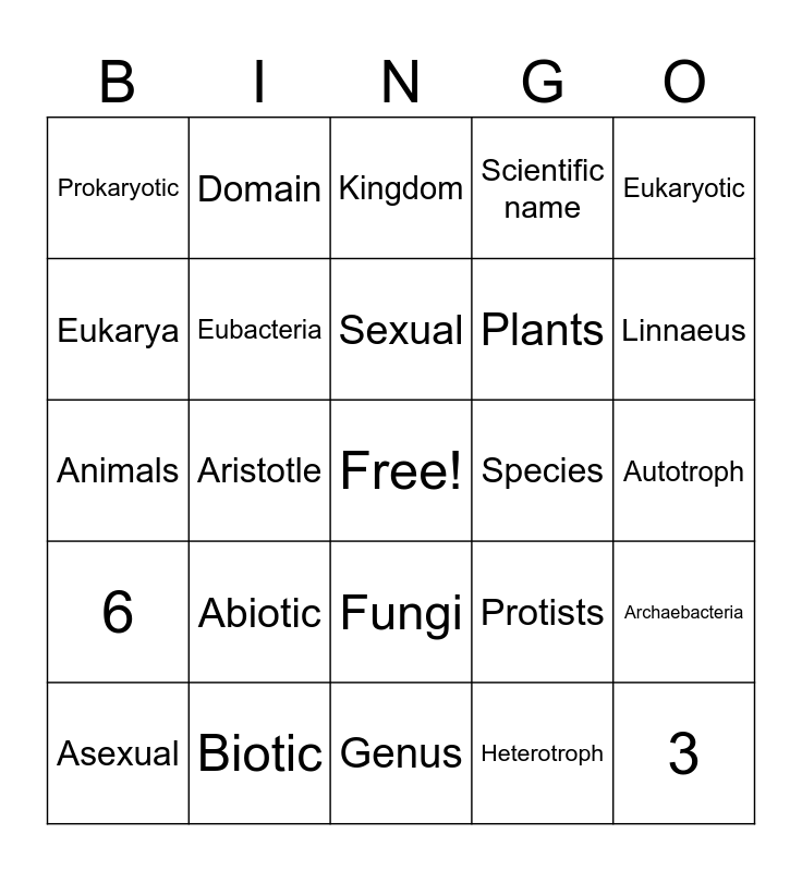 This bingo card has a free space and 24 words: Abiotic, Biotic, Sexual, Asexual, Eukaryotic, Prokaryotic, Eukarya, Domain, Species, Fungi, Plants, Animals, Protists, Archaebacteria, Eubacteria, Heterotroph, Autotroph, Kingdom, Linnaeus, Aristotle, 3, 6, Scientific name and Genus.
