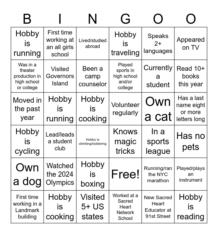 This bingo card has 36 words: Free!, Hobby is boxing, Worked at a Sacred Heart Network School, Was in a theater production in high school or college, Hobby is cycling, Volunteer regularly, Visited Governors Island, Visited 5+ US states, Speaks 2+ languages, Running/ran the NYC marathon, Read 10+ books this year, Hobby is traveling, Played/plays an instrument, Hobby is running, Played sports in high school and/or college, Hobby is running, Own a dog, Own a cat, Moved in the past year, Lived/studied abroad, Hobby is cooking, Lead/leads a student club, Knows magic tricks, Hobby is climbing/boldering, In a sports league, First time working at an all girls school, Currently a student, Hobby is cooking, Been a camp counselor, Appeared on TV, Hobby is reading, First time working in a Landmark building, Has no pets, Has a last name eight or more letters long, Watched the 2024 Olympics and New Sacred Heart Educator at 91st Street.