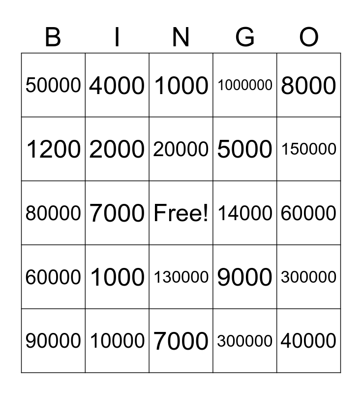 This bingo card has a free space and 24 words: 90000, 1000, 20000, 300000, 8000, 50000, 4000, 1000, 14000, 60000, 80000, 2000, 9000, 300000, 1200, 10000, 7000, 1000000, 150000, 60000, 7000, 130000, 5000 and 40000.