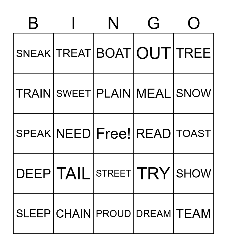 This bingo card has a free space and 24 words: TAIL, CHAIN, PLAIN, SLEEP, TREE, SNEAK, TRAIN, TREAT, READ, STREET, MEAL, SPEAK, TRY, SHOW, SWEET, DREAM, TOAST, BOAT, SNOW, NEED, TEAM, DEEP, OUT and PROUD.