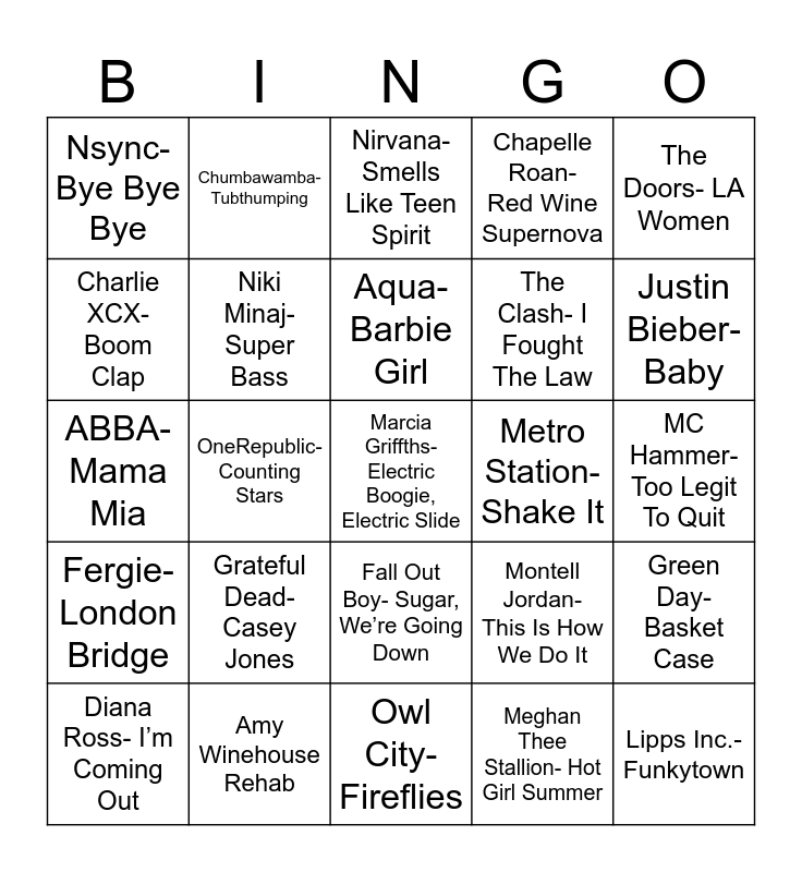 This bingo card has 31 words: Owl City- Fireflies, The Offspring- Pretty Fly, OneRepublic- Counting Stars, ODB- Got Your Money, Nsync- Bye Bye Bye, Nirvana- Smells Like Teen Spirit, Niki Minaj- Super Bass, Montell Jordan- This Is How We Do It, Metro Station- Shake It, Meghan Thee Stallion- Hot Girl Summer, MC Hammer- Too Legit To Quit, Marcia Griffths- Electric Boogie, Electric Slide, Lipps Inc.- Funkytown, Karol G- Cairo, Justin Bieber- Baby, Harry Bellafonte- Jump in the Line, Green Day- Basket Case, Grateful Dead- Casey Jones, Fergie- London Bridge, Fall Out Boy- Sugar, We’re Going Down, The Doors- LA Women, Digital Underground- Humpty Dance, Diana Ross- I’m Coming Out, Chumbawamba- Tubthumping, The Clash- I Fought The Law, Charlie XCX- Boom Clap, Chapelle Roan- Red Wine Supernova, ABBA-Mama Mia, Amy Winehouse Rehab, Aqua- Barbie Girl and Avril Lavigne- Girlfriend.