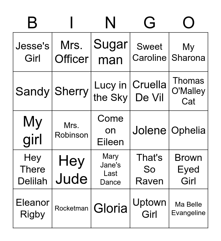 This bingo card has a free space and 39 words: Dirty Diana, Roxanne, Billy Jean, Sherry, Eleanor Rigby, Mary Jane's Last Dance, Lucy in the Sky, Bennie and the Jets, My Sharona, Hey There Delilah, Mrs. Robinson, Sweet Caroline, Ma Belle Evangeline, Ophelia, Jolene, Hey Jude, Cecilia, Jesse's Girl, Brandy, That's So Raven, Sandy, Gloria, Cruella De Vil, Thomas O'Malley Cat, Clint Eastwood, Chelsea Dagger, Mr. Sandman, Mr. Blue Sky, Mr. Brightside, Mrs. Officer, Mrs. Jackson, Starman, Sugar man, Rocketman, Uptown Girl, Piano man, Brown Eyed Girl, My girl and Oh Pretty Woman.