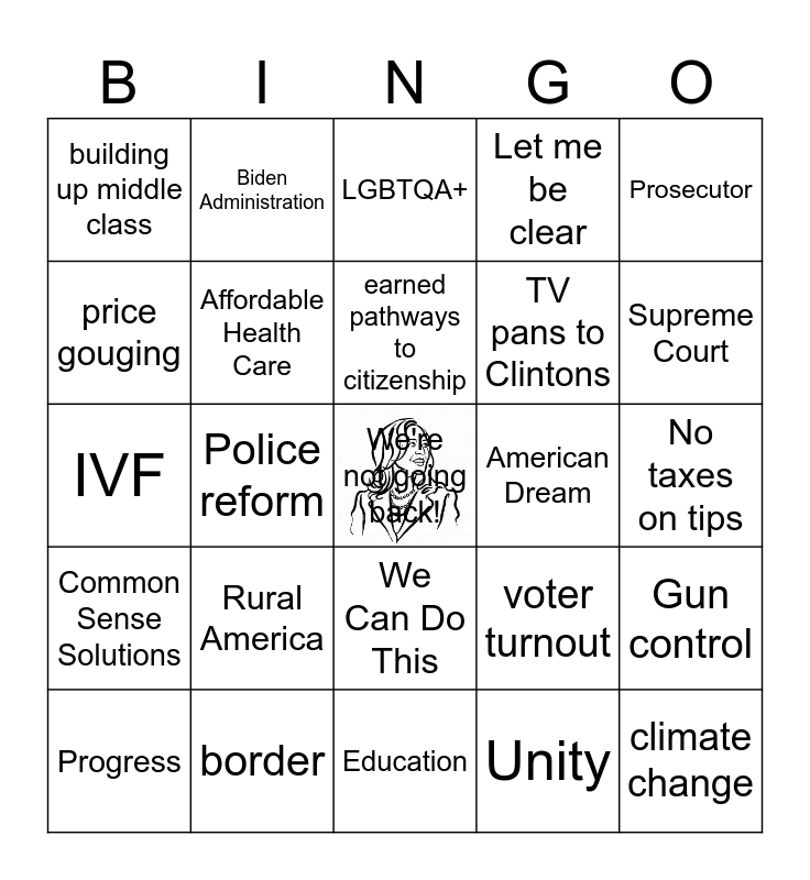 This bingo card has a free space and 24 words: Rural America, border, earned pathways to citizenship, Progress, Prosecutor, building up middle class, price gouging, Biden Administration, American Dream, We Can Do This, TV pans to Clintons, IVF, voter turnout, Gun control, Affordable Health Care, Unity, No taxes on tips, LGBTQA+, Supreme Court, Police reform, climate change, Common Sense Solutions, Let me be clear and Education.