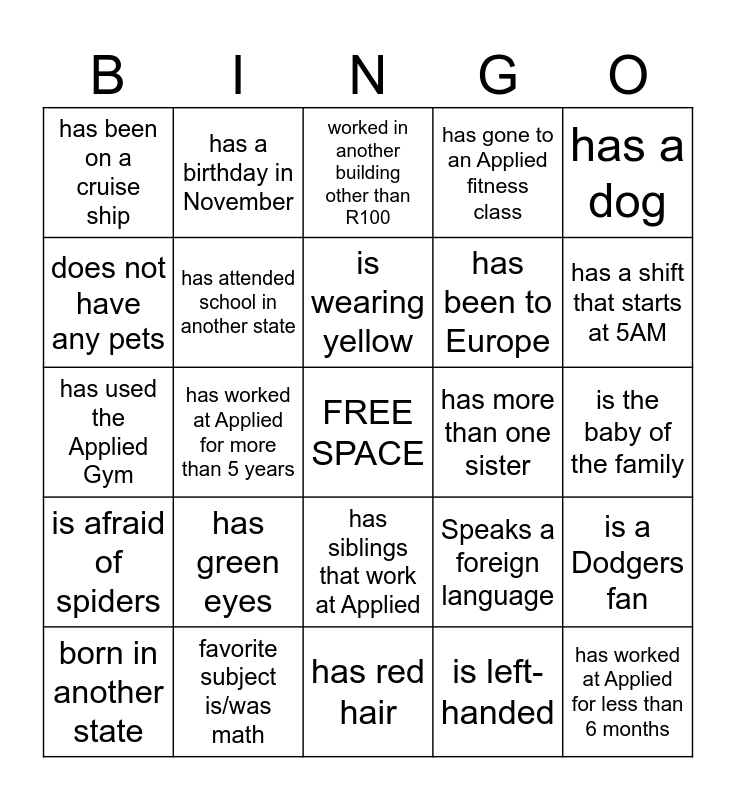 This bingo card has a free space and 24 words: has green eyes, favorite subject is/was math, is wearing yellow, born in another state, has a dog, has been on a cruise ship, does not have any pets, has a birthday in November, has more than one sister, has siblings that work at Applied, has been to Europe, has used the Applied Gym, Speaks a foreign language, is a Dodgers fan, has attended school in another state, is left-handed, is the baby of the family, worked in another building other than R100, has a shift that starts at 5AM, has worked at Applied for more than 5 years, has worked at Applied for less than 6 months, is afraid of spiders, has gone to an Applied fitness class and has red hair.